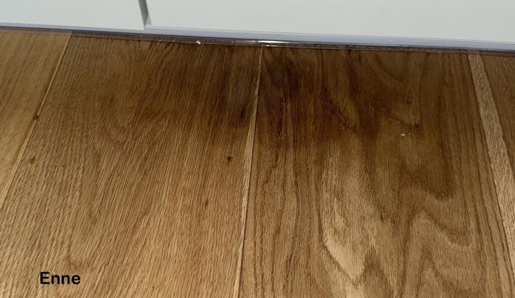 Niiskuskahjustused tekivad põrandale kõige sagedamini toataimede pottide alla. Samuti on viimastel aastatel hakatud jõulukuuski pottides müüma. Juhul kui taimepott on põrandal, ei piisa sellest, kui selle all on savist või keraamiline alus. Need materjalid imavad niiskust ja kannavad selle edasi põrandasse. Samuti võib nt nõudepesumasin hakata lekkima. Selle tulemusel on põrand pidevalt ühest kohast märg ja niiske ning hakkab selle tulemusel tumedaks muutuma. Niiskuskahjustuste eemaldamise esmane ja põhireegel on – mida kiiremini reageerid, seda kergemini saab kahjustusest vabaks. Omame kogemusi niiskuskahjustuste eemaldamisel erinevate keemiliste ainetega. Ei pea hakkama kogu põrandat lihvima. Mõningatel juhtudel võtab kahjustuse kadumine kaua aega. Sellises olukorras oleme jätnud sobivad vahendid kliendile ja andnud vajalikud juhised, kuna sama protsessi tuleb palju kordi korrata. Pärast niiskuskahjustuse eemaldamist, tuleb see koht ka uuesti viimistleda. Praktikas oleme teinud kogu põranda hooldusõlitamise, kuna põrand on seda vajanud. Nii jääb ka tulemus ühtlane.